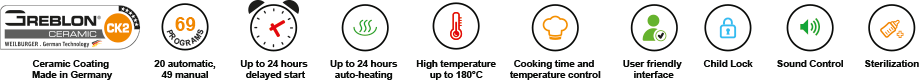| وعاء | وعاء داخلي بسمك 2 مم مصنوع من خليط الألمنيوم و مغطى بطبقة سراميك من قبل شركة Greblon® ألمانيا. |